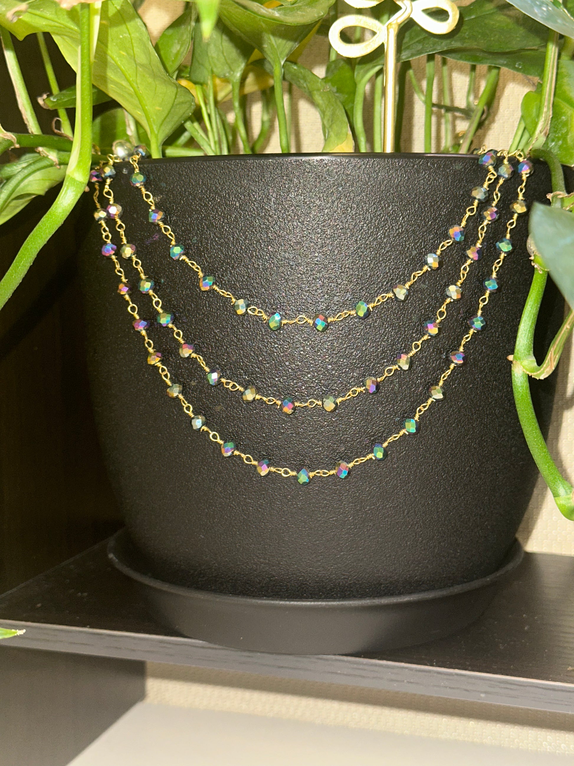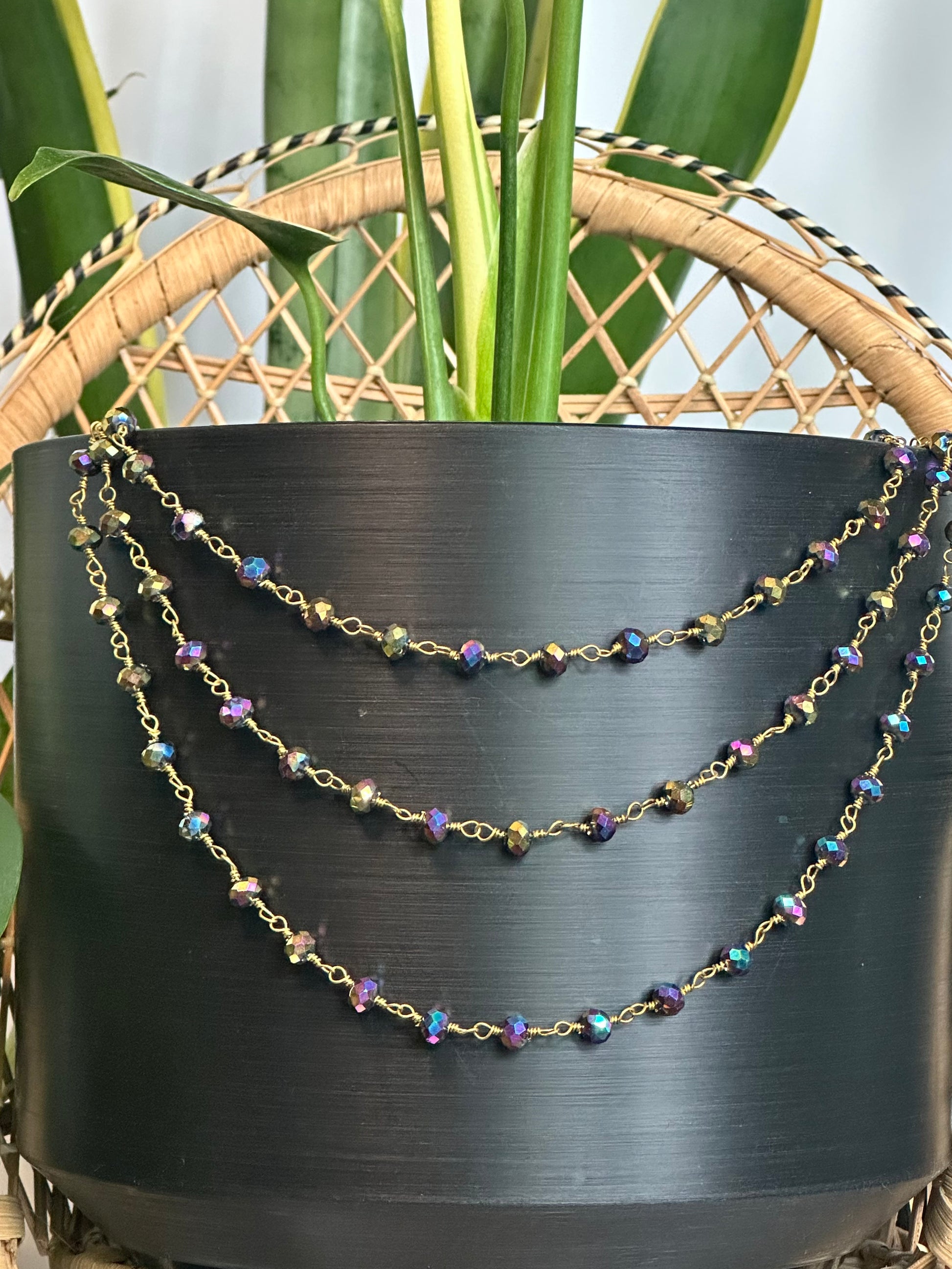 These Rainbow Chalcedony beads are approximately 6mm and hand wrapped on a gold-plated wire. They catch the light beautifully, offering beautiful reflections of green, purple, blue and pink!